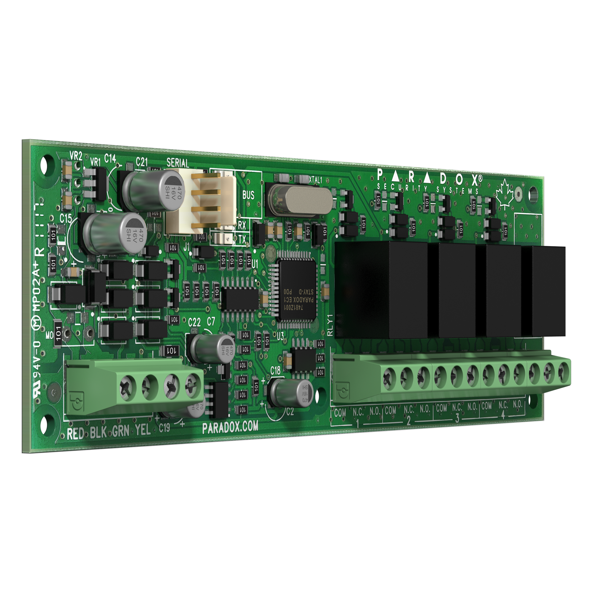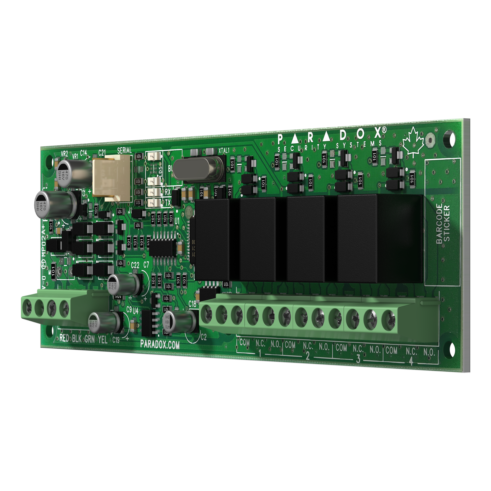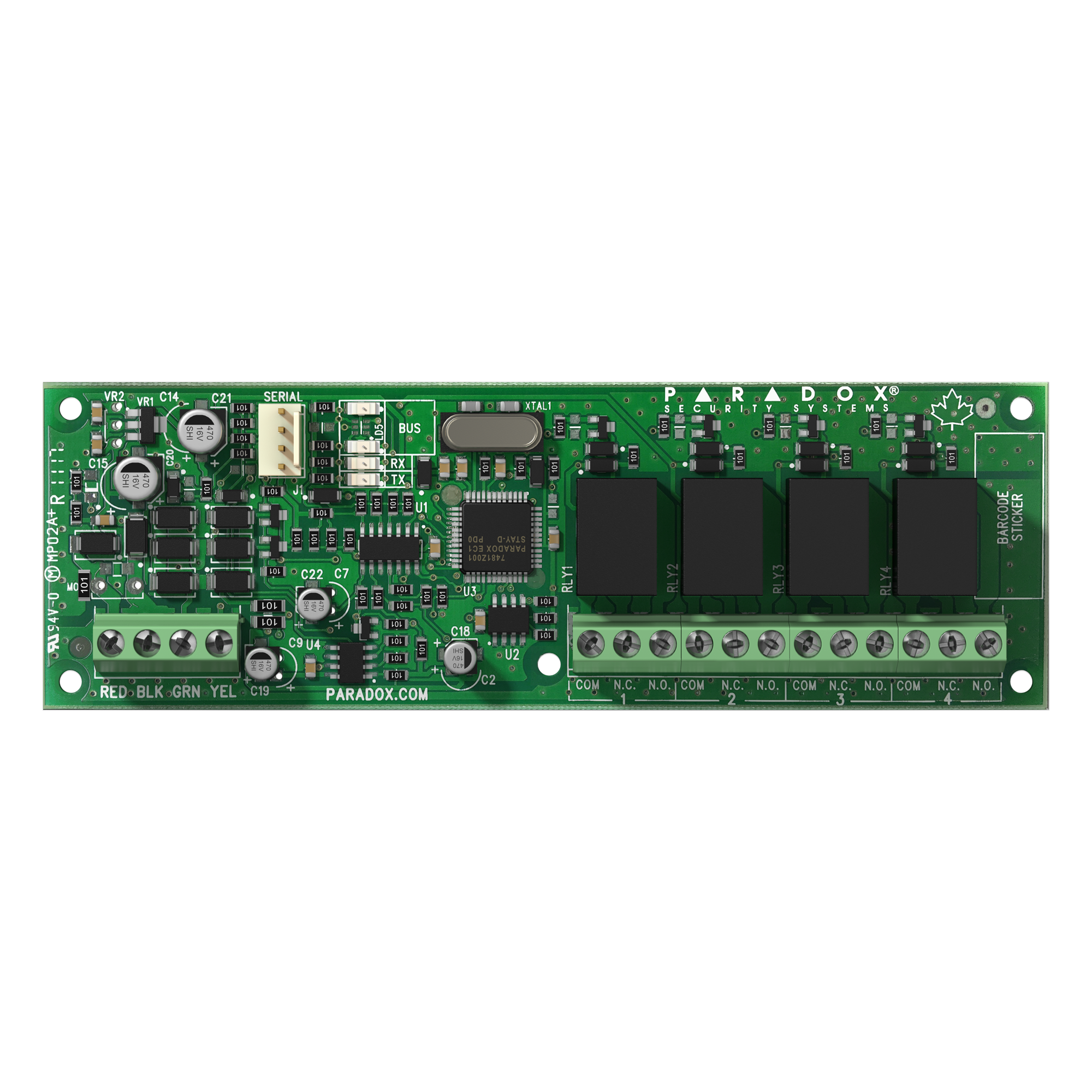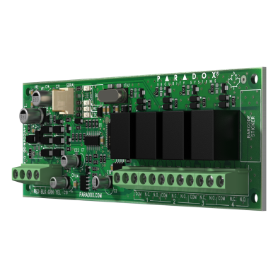 The PGM4 Programmable Output Expansion Module includes four programmable relay outputs. Compatible with all Paradox control panels. Outputs can be activated using the BlueEye mobile application, integrated manual switches or programmed to follow system events. Each output can drive 4A/24V loads.