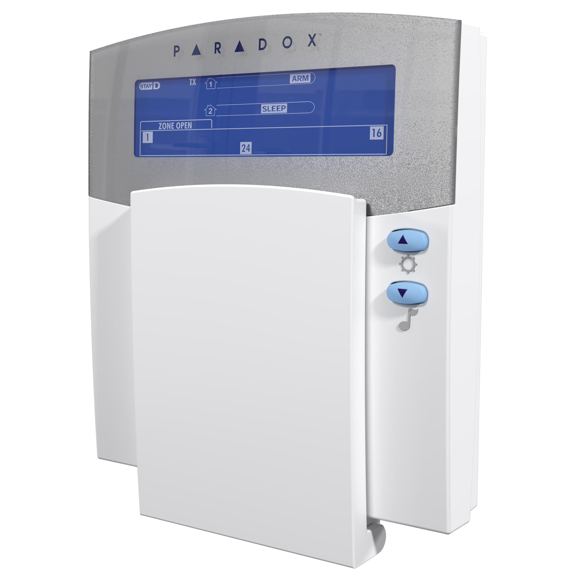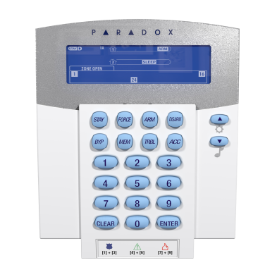• Goes into sleep mode after 20 seconds to save battery life, but remains synchronized with the panel to automatically wake up upon an entry delay or an alarm to provide full functionality (system status, zone display and buzzer)