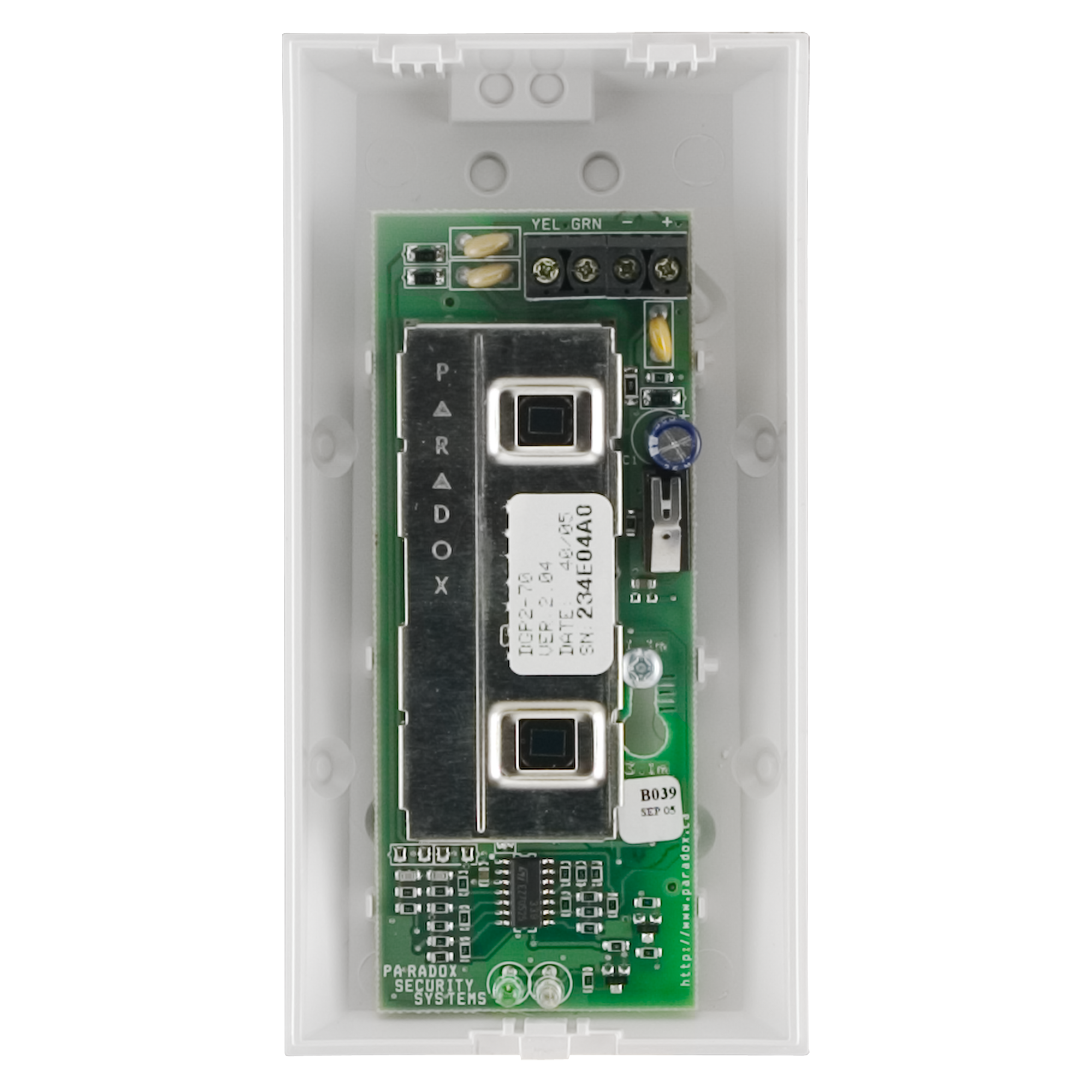 Paradox DM70 is a high-security dual optic motion detector module compatible with the EVO192 panel. It is immune to pets weighing up to 40kg (90lbs); features 2 dual opposed element sensors, and Paradox's Digital Shield algorithm software to improve reliability and reduce false alarms.
