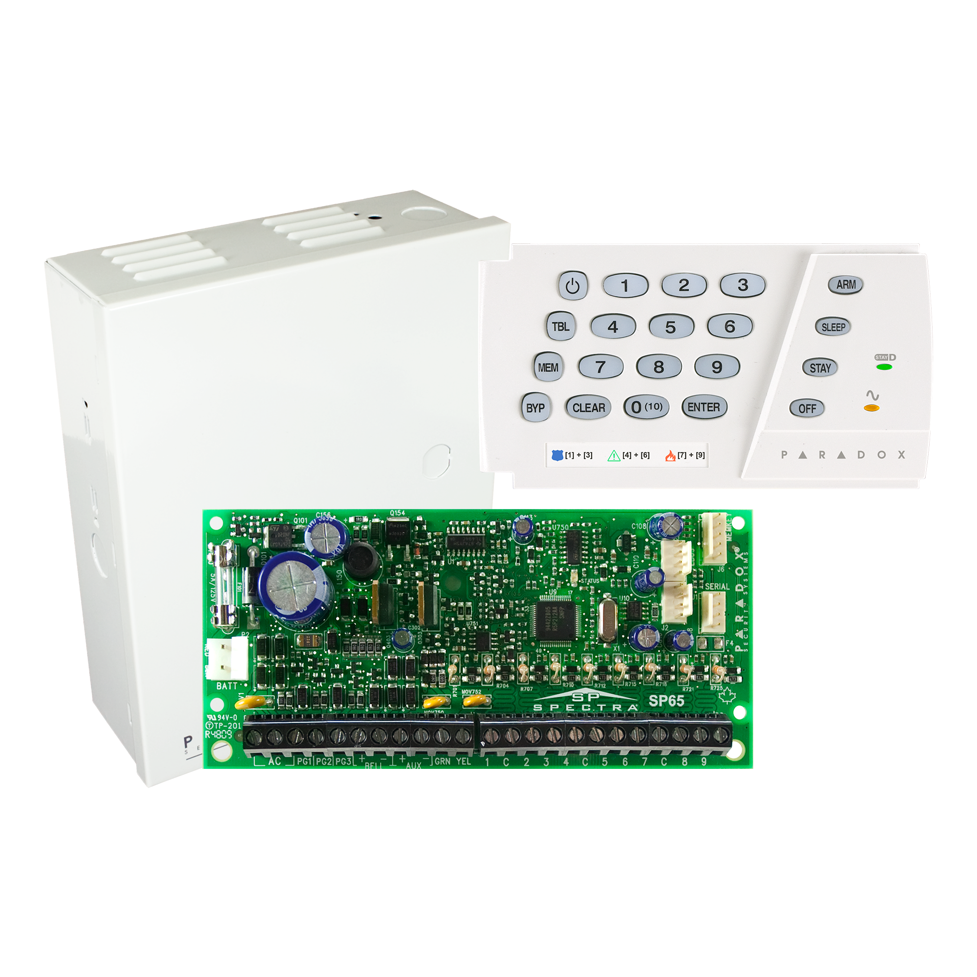 1 x SP65 PANEL: The SP65 control panel offers a combination of innovative features and an advanced communication bus for a uniquely expandable security system.