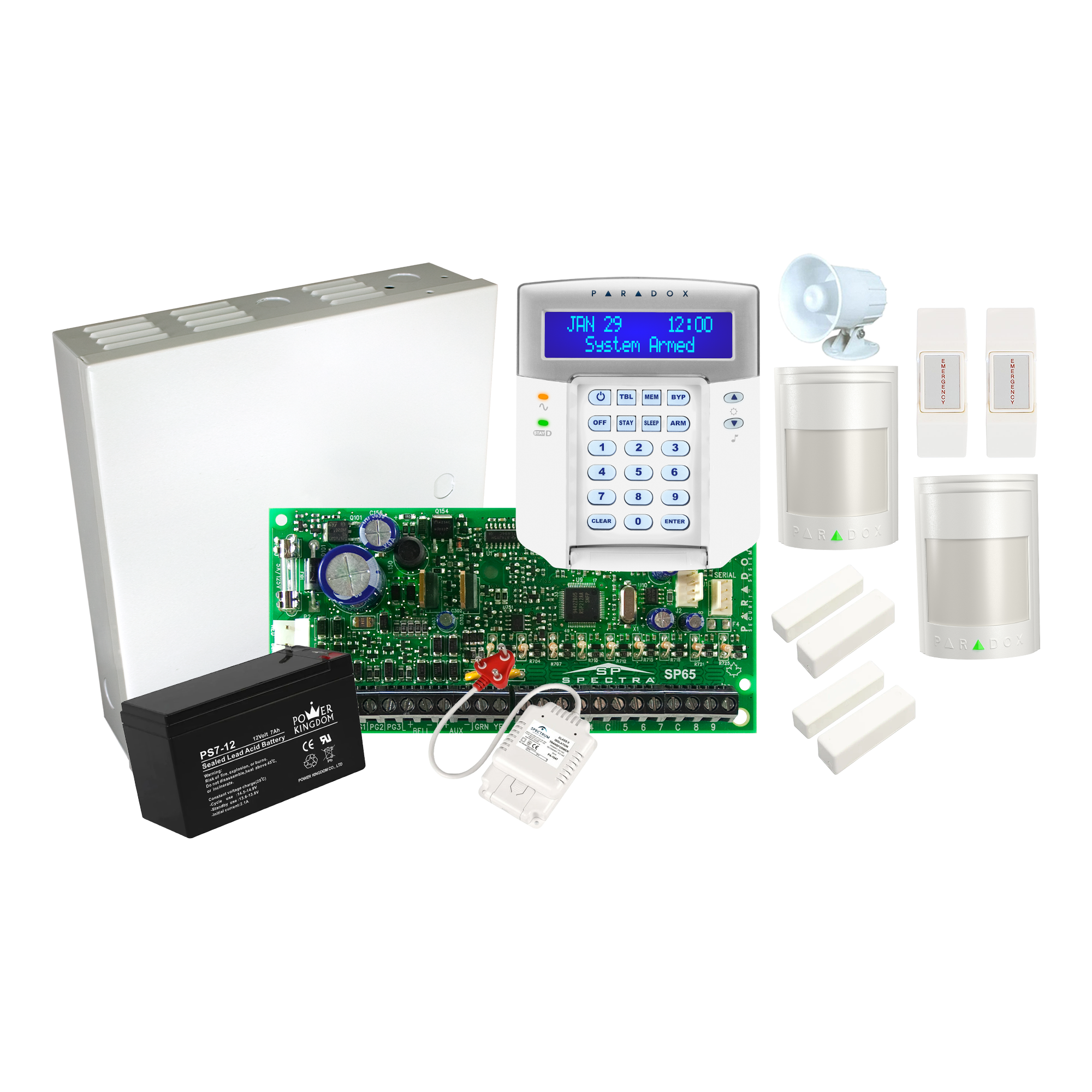 1X SP65 Panel 2X 476+ Pro Passives 1X K32LCD+ Keypad 1X Metal Box 1X 12V 7AH Battery 1X 15W Siren 2X Emergency Buttons 2X White Magnetic Contacts 1X 50VA 16VAC Transformer